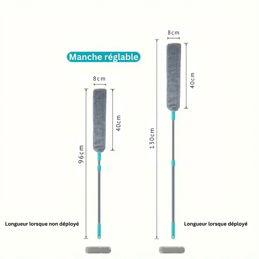 La PortéePoussière™ possède un manche télescopique de 96 cm à 130 cm de long et une tête de brosse fine de 42 × 8,5 cm. Elle s’adapte ainsi sous les meubles bas et dans les fissures étroites.